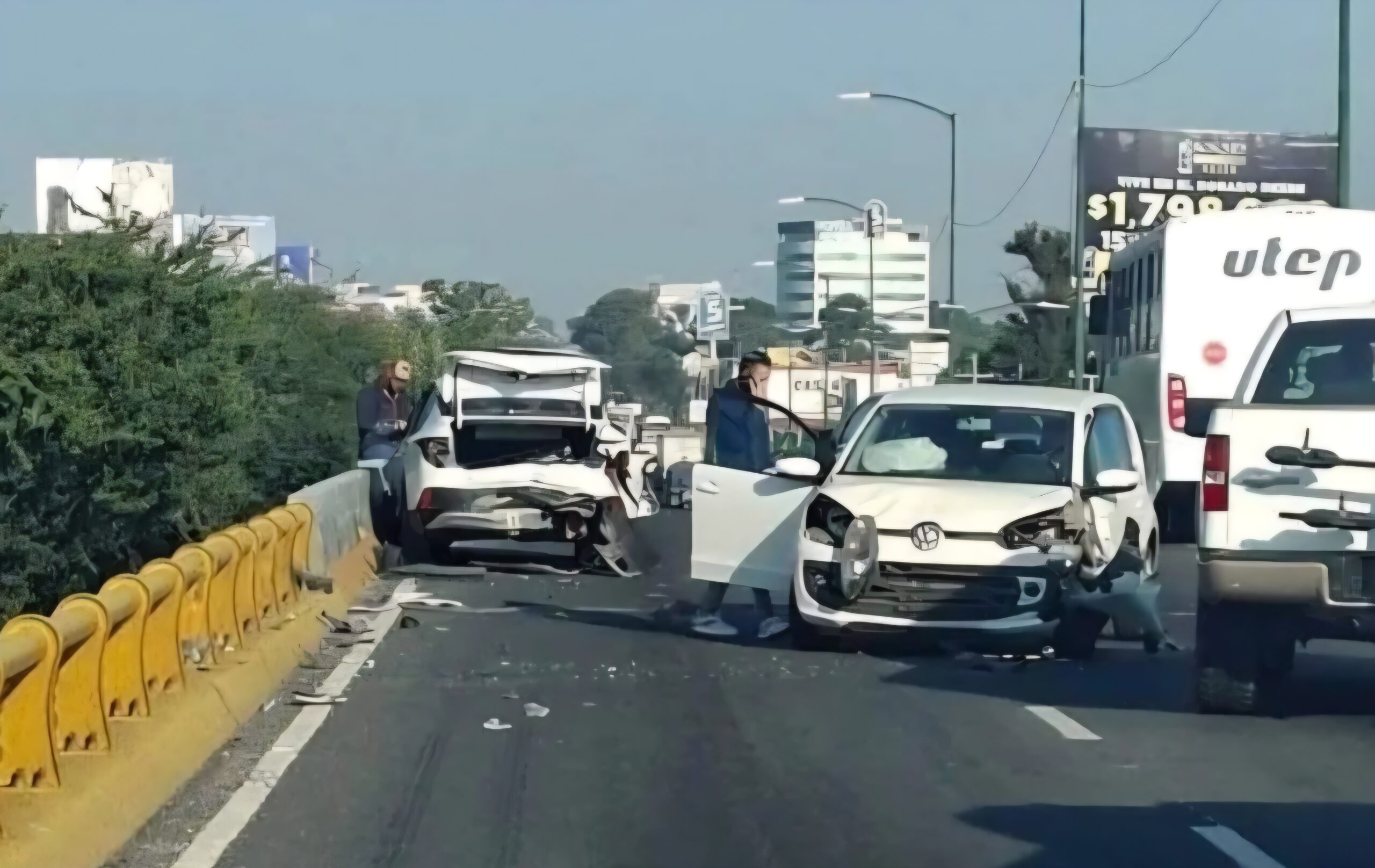 El percance ocurrió alrededor de las 8:30 a.m., cuando dos vehículos particulares, ambos de color blanco, impactaron de manera frontal y trasera, dejando visibles daños en sus carrocerías. Las bolsas de aire se activaron y varias piezas de los autos quedaron esparcidas sobre el pavimento, reflejando la magnitud del golpe.