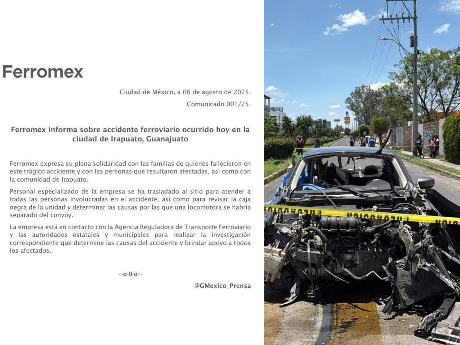Irapuato,  Guanajuato. – Tras el trágico accidente ferroviario ocurrido este miércoles en Irapuato, Guanajuato, la empresa Ferromex emitió un comunicado oficial en el que expresó su solidaridad con las familias de las personas fallecidas, así como con quienes resultaron heridas y con la comunidad irapuatense.