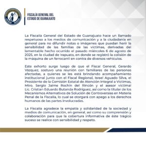 Guanajuato. – La Fiscalía General del Estado de Guanajuato (FGE) exhortó este martes a medios de comunicación y a la ciudadanía a evitar la difusión de notas o imágenes que puedan afectar la sensibilidad de las familias de las víctimas del accidente ferroviario registrado el pasado 6 de agosto en Irapuato.