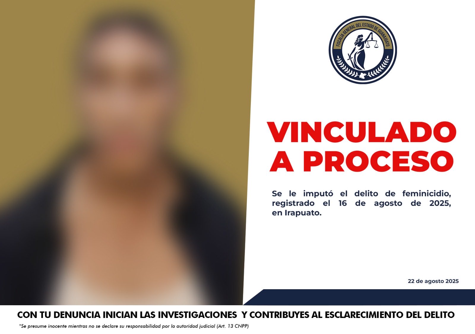 Irapuato, Gto.- La Fiscalía General del Estado de Guanajuato informó que un Juez dictó auto de vinculación a proceso penal contra Héctor Abel “N”, por su probable responsabilidad en el delito de feminicidio, ocurrido el pasado 16 de agosto de 2025 en la colonia Residencial Floresta, en Irapuato.