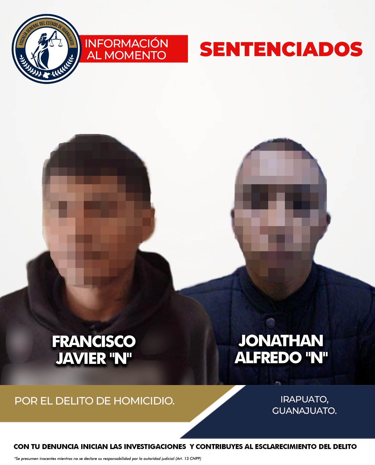 Irapuato, Gto. – La Fiscalía General del Estado de Guanajuato obtuvo sentencia condenatoria contra Francisco Javier “N”, alias “el Panchillo”, y Jonathan Alfredo “N”, alias “el Payaso”, por el delito de homicidio cometido en este municipio.