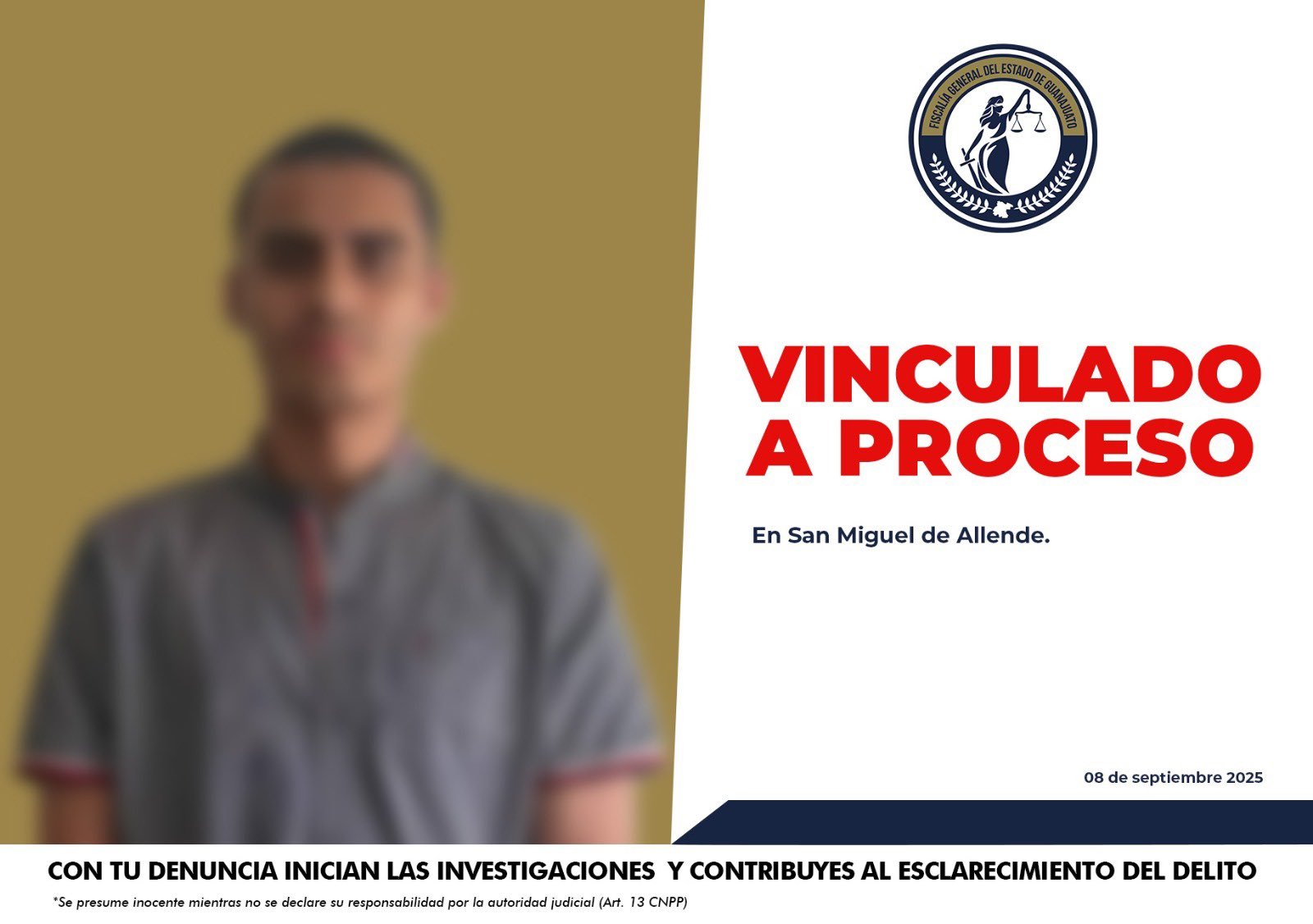 San Miguel de Allende, Gto. — La Fiscalía General del Estado de Guanajuato obtuvo la vinculación a proceso penal contra Jorge “N” por su presunta participación en el delito de privación ilegal de la libertad, ocurrido el 19 de abril de 2021.
